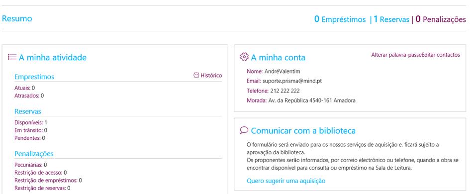 Nesta janela aparecerão os empréstimos, penalizações e reservas actuais, onde os empréstimos podem ser renovados e as